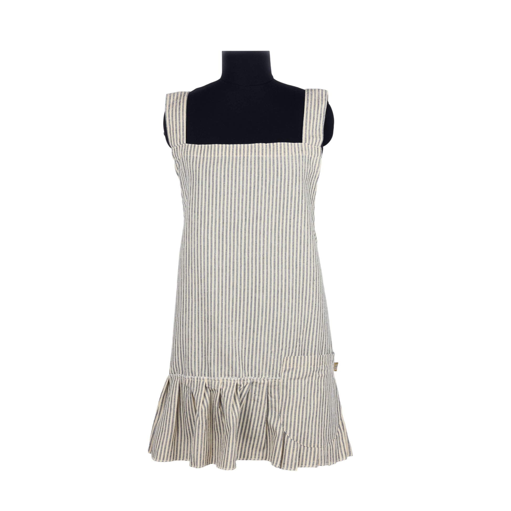 Elevate your wardrobe with the timeless charm of our Manor Stripe apron. The subtle manor stripes bring sophistication to any piece, while the unique button ruffle detailing adds a playful yet refined touch. Thoughtfully designed with an added pocket, this fabric offers both style and function.